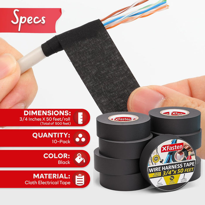 XFasten Wire Harness Tape, Black - 3/4 inch x 50 ft Pack of 10